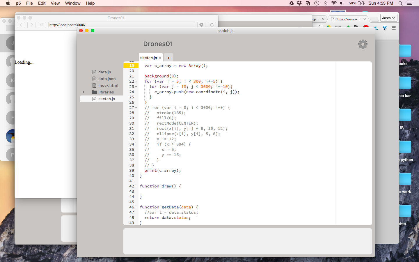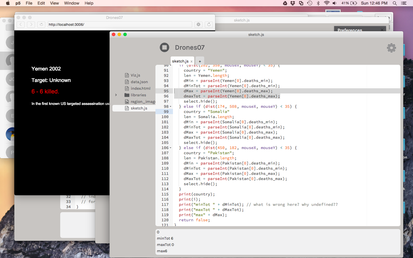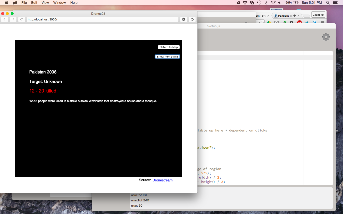 I process data with SAS professionally but working with data in JavaScript is a whole other thing. Also, these data are called an “API” but I had a lot of trouble using it as such–I ended up preloading the data as a JSON file. To make sure I wasn’t doing anything wrong, I used my API code to call weather data, and confirmed that it worked for that. Someone e-mailed the ICM listserv re: an API that wasn’t “live” and I think this may have been the issue I was encountering. But yeah, this website isn’t live-updating (not that drone strikes are confirmed as such and added that often).