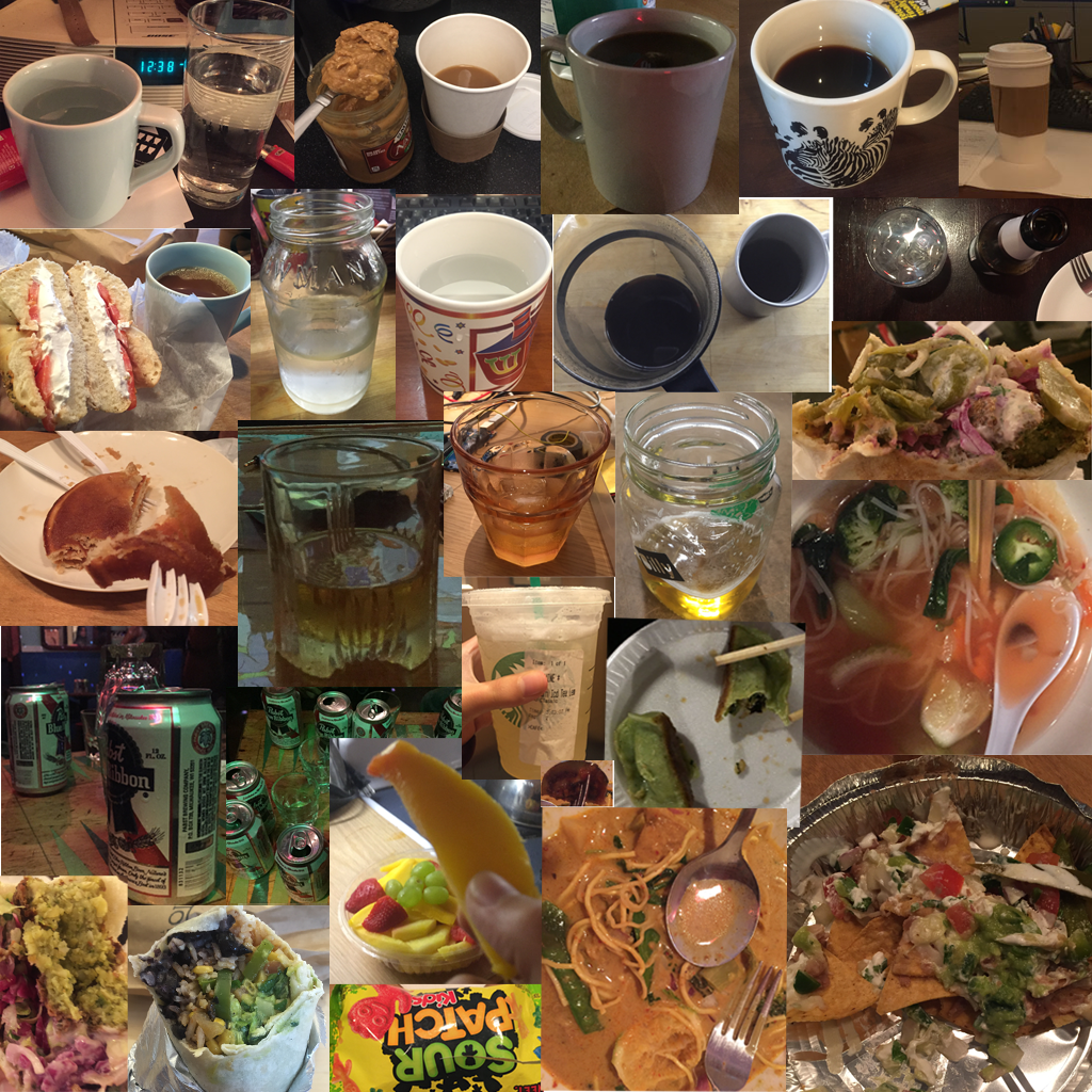 For the color palette of my life I chose to photograph everything I ate and drank for about 75 hours. I chose food and drink partially because I was concerned that this would end up being a project about my office environment, but largely because I’m somewhat fascinated with the phenomenon of people photographing food and presenting it on social media. Sometimes I do like looking at people’s food (I have instagram-searched dumplings, for example), but a lot of the time I find it unappetizing. Also, since people are performing on social media, the food they post is selected based on various criteria (deliciousness, trendiness, etc) depending on the person. I wonder what their diet might look like outside of the curated version they present to the world.