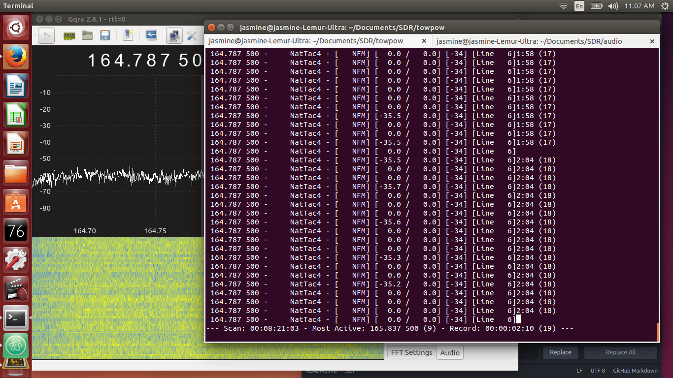 The perl scanning script required Net::Telnet, which we realized when we finally specified the command. We defined a csv file with the frequencies we want to scan–then by specifying the path to the file and running the code below, the gqrx scan script finds the frequency with the most activity and records when the signal strength surpasses a certain level. We allowed more noise in gqrx than we defined in gqrx-scan (so a recording is harder to trigger). Still, we noticed that we occasionally just get recordings of static. Also, moving the SDR seems to affect the levels.