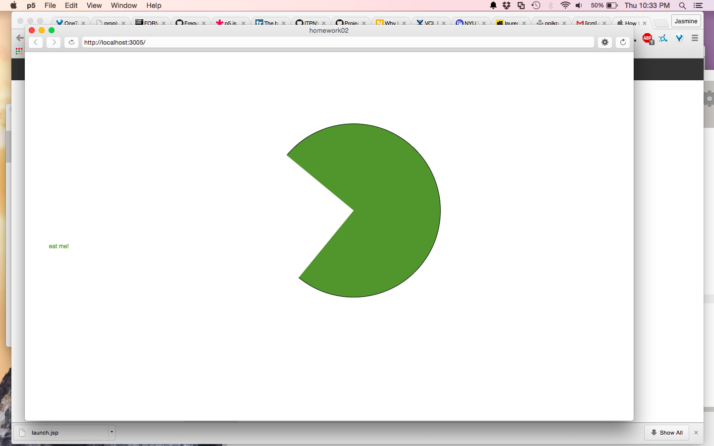 The rules for this assignment were just to have one element controlled by the mouse, one element that changes over time, independently of the mouse, and one element that is different every time you run the sketch. I was excited to work with arcs after learning how they worked in the last class, and played with transparent arcs, and stacking them, imagining a kind of spinning ever-changing spiral. After Dr. Mitu Khandaker-Kokoris, game developer and NYU Games professor, came to speak to our Applications class, I wondered if I already had the skills enough to make a game. That, along with the creation of this Pacman-like arc-element I created when playing around became the inspiration for a game.