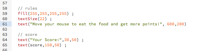 Adding instructional text was fine, but when I went to pass a value through the text() function, I wasn’t sure how. I wanted players to start with a score and be sad to see it continue to fall, so I was incrementing a variable down. It turns out a variable can be an argument for the text function, but I called the text function twice–once for the quoted text and once for the variable. I didn’t play with font and style–I realized I don’t know which standard fonts to expect to be available. I also don’t have a favorite font or anything. I should work on this.