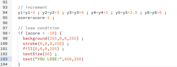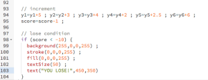 I wanted to make sure players could lose, so I skipped ahead to Shiffman’s week 3 video on conditionals. The syntax wasn’t too hard to get down! The final product is “playable” here.