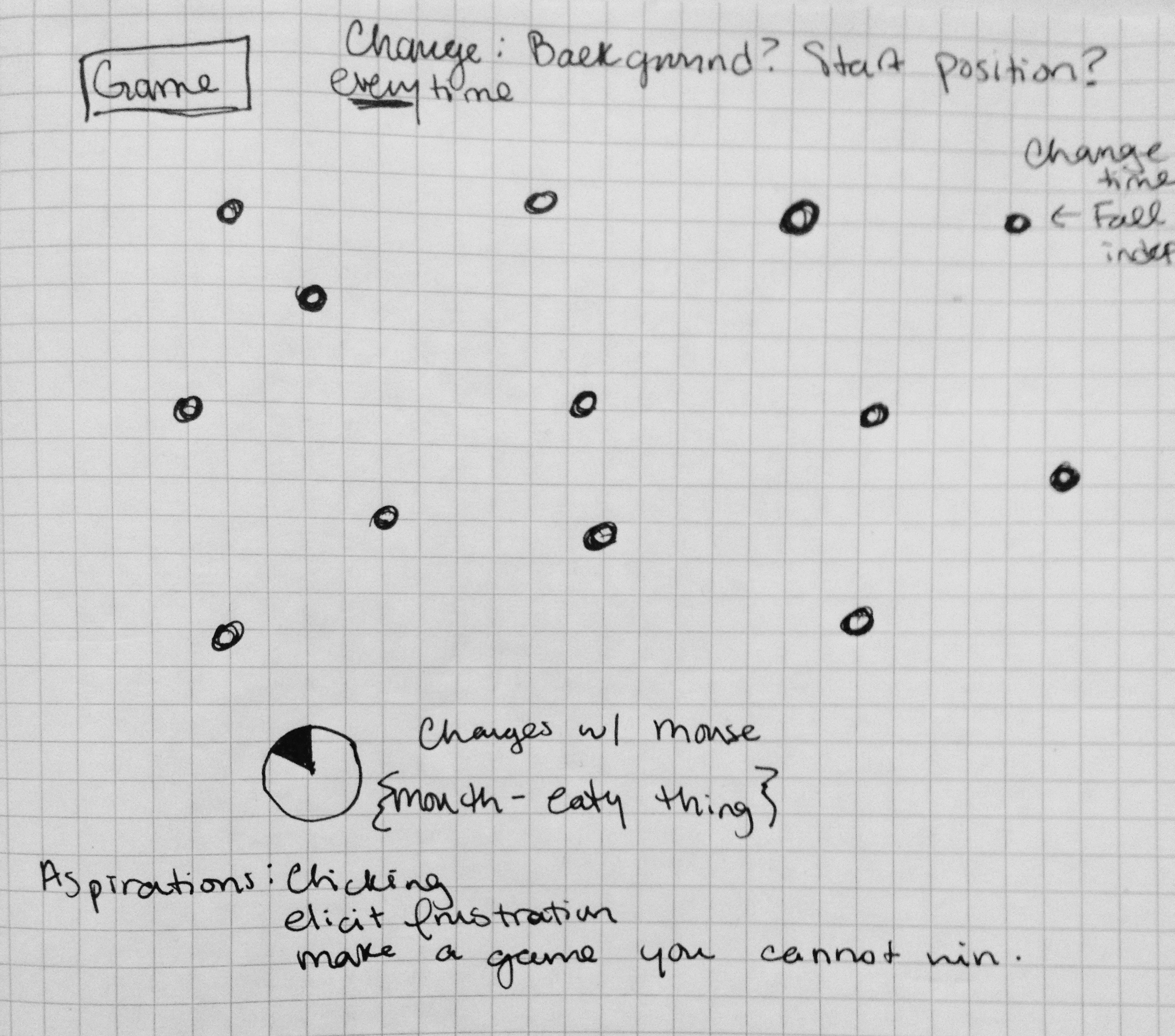 I thought it would be funny to create a game that you could not win and would make the player perpetually more frustrated. (Is it a game if you can’t win? This is a question for another time.) I also wasn’t confident in my ability to execute something complicated, with clicking (how do you click and have that result in an action?) and other rules to make it a functional game that you actually could win. So, my element that would be controlled by the mouse would be the player, my element that would change over time would be the falling “food” (I also added a score), and my element that would change each time would be the background color of the game.