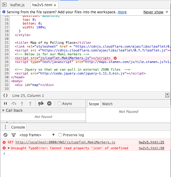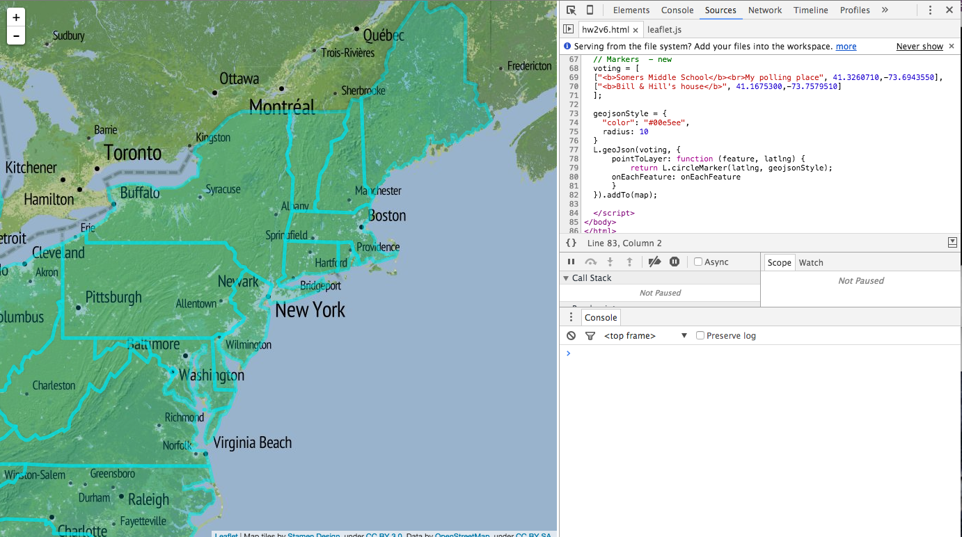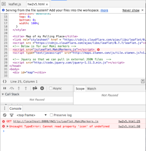In going through the examples and then adapting them to my data, I felt unclear on the difference between pulling json from an outside file versus defining it in the html (there are probably best practices for this sort of thing, too). I was also wondering if the code we use to assign these data to a variable, when referring to an outside sheet, is the same for any json or if this code was specific to geojson? I saw in the leaflet documentation that there are specific fields the json should have. That made me wonder if pulling json in some other format, say with different variables for lat long, rather than an array, would break the leaflet code?