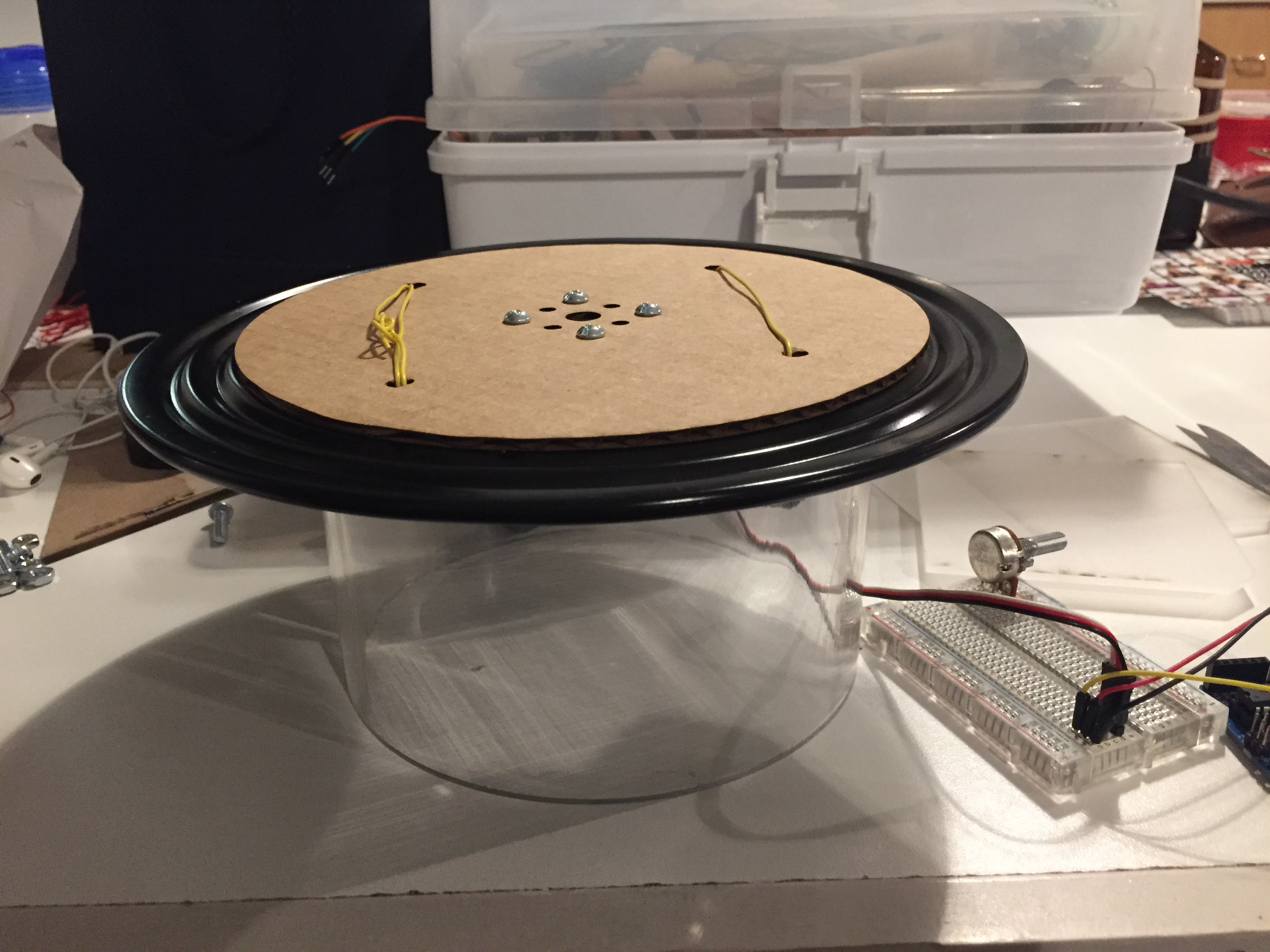 First, we tested with a lazy susan, some gears, and a 360 servo motor. We figured to get the precision we needed we should use a stepper motor, which we got to work with an EZ driver (as opposed to an H bridge). The EZ driver has pins for power (it needs 5V), direction, speed, and the stepper motor itself. Once we got our proximity sensors, we tested a very initial sketch that controls the speed and direction of the turn based on where the sensor detect something.