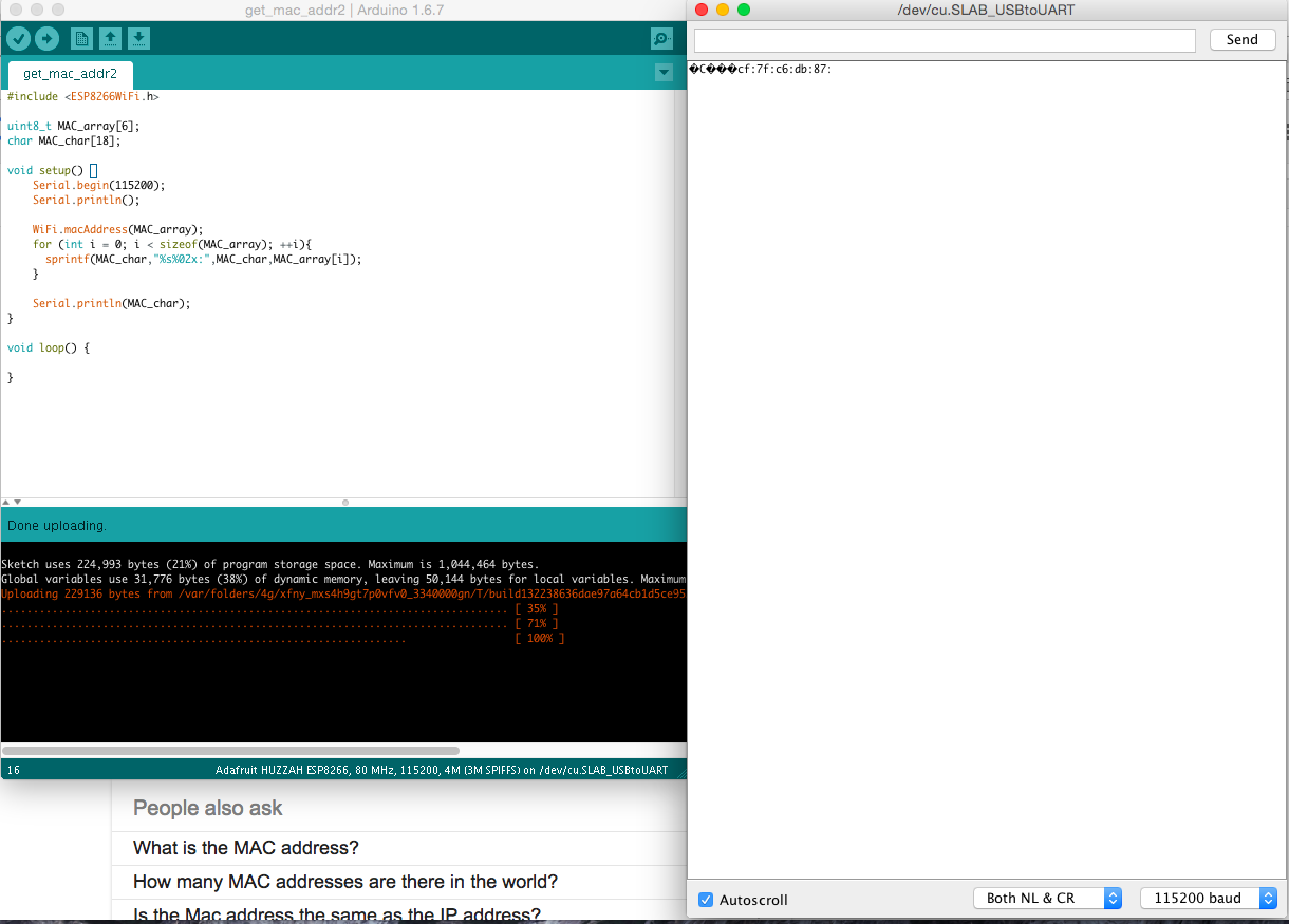 The lowest priority piece right now, and the part I’m least sure will work, is sending the data wirelessly to node rather than having wires. We thought we might be able to use a huzzah wifi module, but to test it on the floor we need to get the mac address from the device, and I’ve already run into trouble. **UPDATE: Was able to read the mac address by printing it in loop instead of setup.